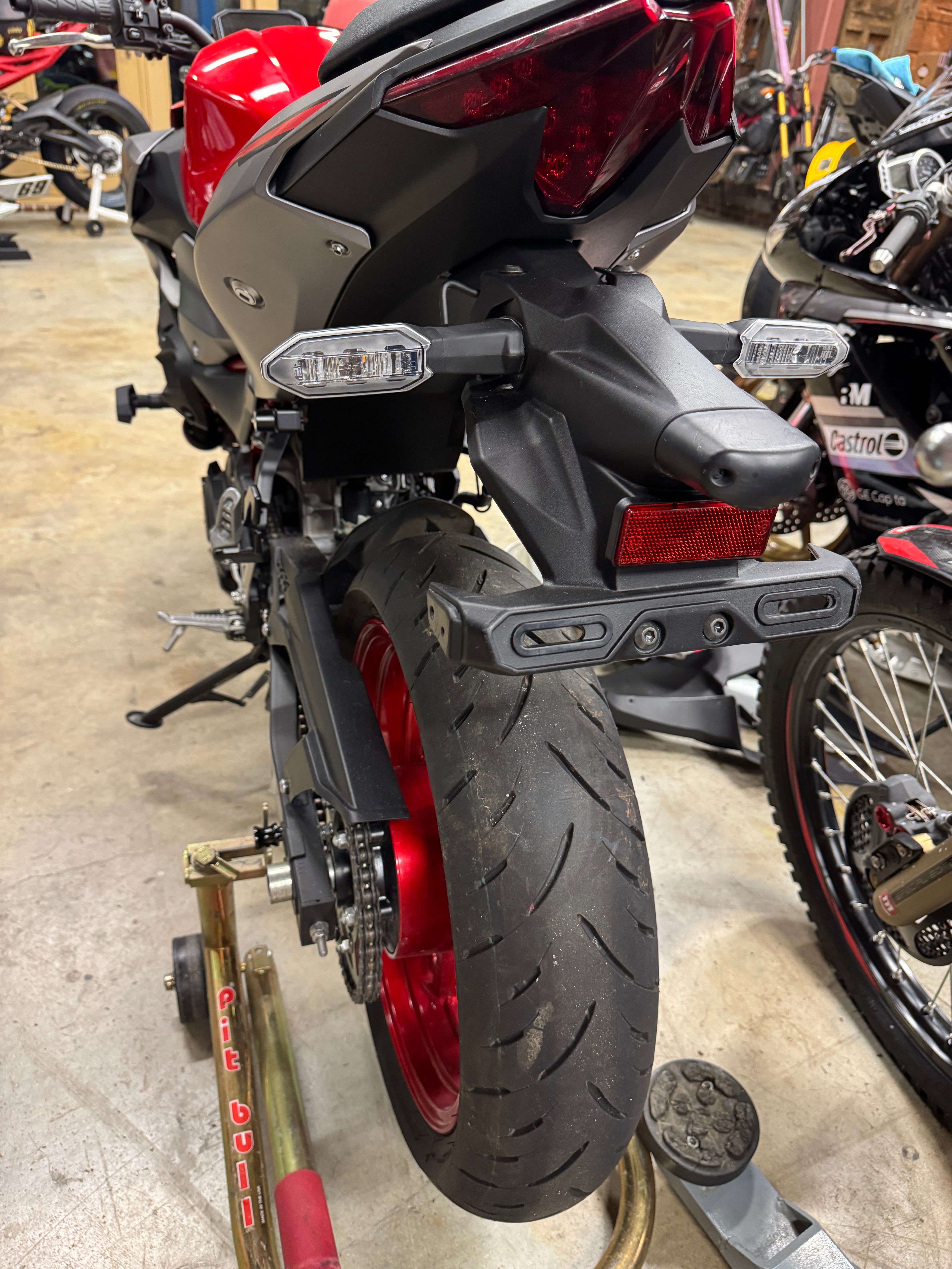Rear spools, frame sliders, flush mount turn signals, fender eliminator.